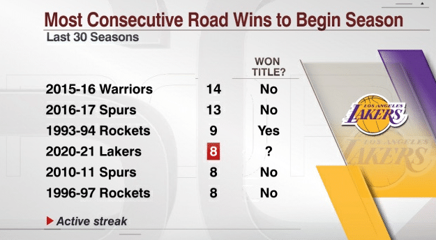 178直播1月23日讯 近日湖人开启了连续7个东部客场之旅,他们在第一场就击败了强大的雄鹿,这样湖人本赛季开局客场8战全胜,创造了队史的新纪录。不少球迷觉得这个赛季的湖人真的是不可阻挡,客场都可以连续取胜,卫冕的希望更大了。但很快有数据统计出炉,最近30年来,开局客场8连胜甚至更高的球队中,只有1队夺冠了,联想到能够做到如此壮举的必定是豪强和夺冠热门,这样的概率就确实太低了。