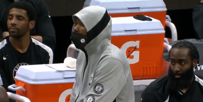 这样三巨头都在场边观看比赛,镜头给过去的时候,我们发现哈登在场边愣神,他并没有看比赛,则是在盯着地下有些发呆,这是哈登来到篮网之后第一次吃到连败,全场他只出手14次,命中6球,19分5板11助,没有了最开始两场比赛的意气风发。