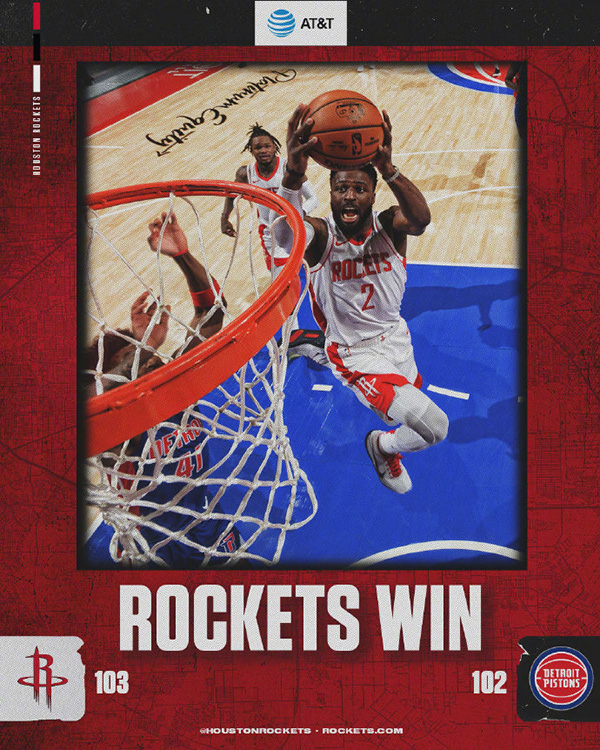 末节,麦克勒莫三分再进,恩瓦巴反击打进还在篮下打成2+1,布朗篮下打进又飚进两记三分,火箭连抢前场篮板火力全开,随着奥拉迪波三分也进,轰出了18-6的高潮重新领先8分。格兰特两罚全中后约什-杰克逊飚进三分,活塞追到只差2分。两队继续撕咬,最后29秒格里芬三分命中,活塞追到1分,奥拉迪波三分不中,格里芬抢下关键篮板,最后3.4秒格兰特强攻打进,却超时无效,最终火箭103-102惊险取胜。