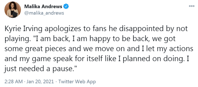 “我回来了,我很高兴能回来,”欧文对记者说,“我们得到了非常棒的球员,球队会继续前进。像我计划中的那样,我会用自己的行动和比赛来说话。此前,我只是需要暂停一下。”