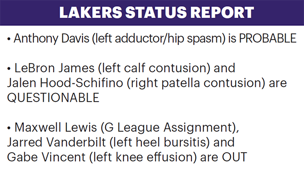 浓眉(左内收肌/臀部紧张)大概率出战,75%出战可能性;詹姆斯(左小腿挫伤)和席菲诺(右髌骨挫伤)出战成疑,50%出战可能性;刘易斯(G联赛)、范德比尔特(左脚跟)和文森特(左膝积液)都缺席比赛。