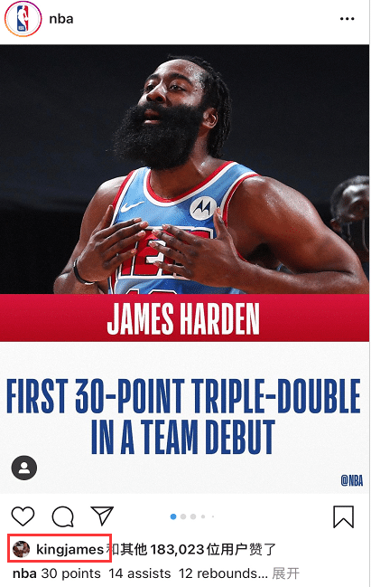 比赛结束之后,NBA官方在社交媒体上晒出了哈登的里程碑数据,祝贺他首战就拿下了30+的三双,历史第一人,创造纪录。很快我们发现湖人核心勒布朗-詹姆斯也点赞了,很显然今天没有比赛任务的詹姆斯也一直都在关注哈登的首秀,而且赛后给哈登的里程碑数据点赞。
