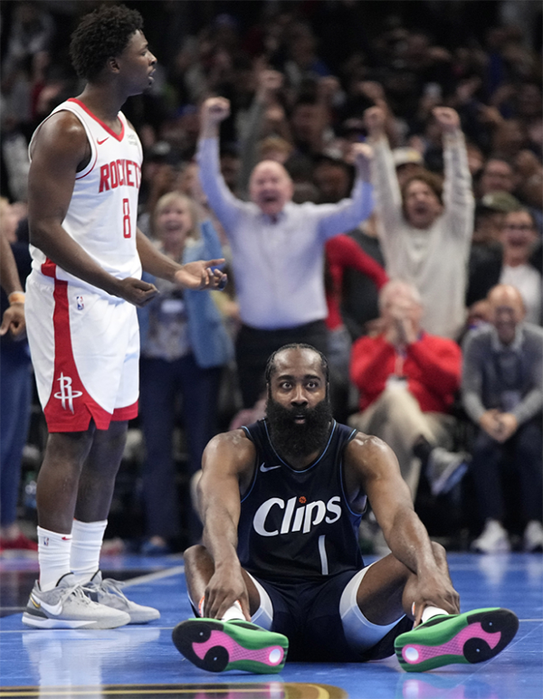 快船替补席沸腾了,威少等人都站起来为哈登庆祝。