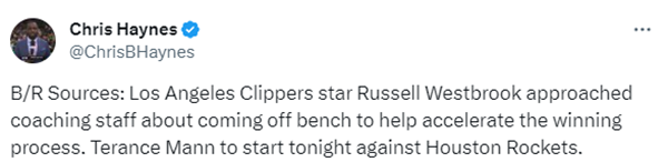 据名记Chris Haynes报道,快船球星威少已经主动向球队申请替补出战,以帮助首发阵容建立化学反应。