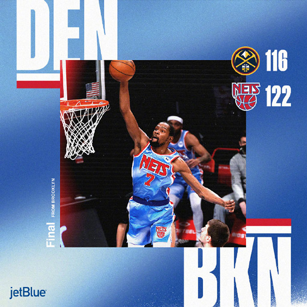 篮网122-116逆转掘金 杜兰特34+9+13 约基奇23+7+11+7断