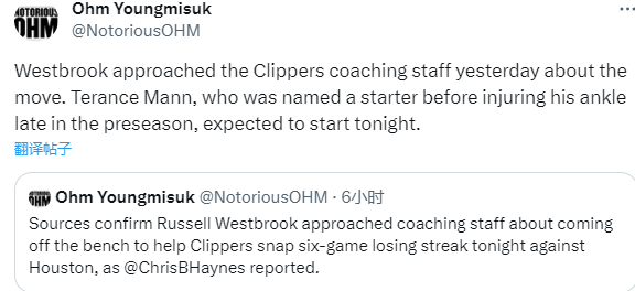 快船战火箭首发预计是小卡、哈登、乔治、祖巴茨和曼恩,这将是快船本赛季第一次使用这样的首发;威少已经主动申请替补,曼恩顶替威少进入首发阵容,威少快船生涯首次替补;遭遇6连败之后,快船大变阵——威少替补,泰斯预计担任快船替补中锋出战。