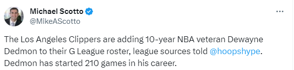 为了补强内线,快船还留一个后手,据名记Michael Scotto报道,快船已将10年老将中锋戴德蒙加入其下属发展联盟球队名单。