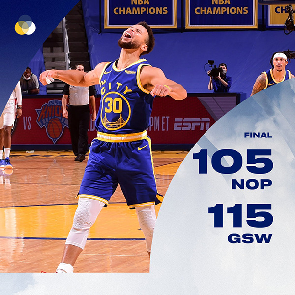 勇士(5-4):库里38分11助攻3抢断,维金斯16分6篮板,怀斯曼9分6篮板2封盖,乌布雷6分5篮板,帕斯卡尔12分6篮板,达米恩-李8分2助攻,贝兹莫尔6分2助攻3抢断。