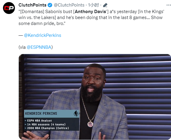 浓眉全场9分的糟糕表现遭群嘲,名嘴帕金斯表示:小萨又打爆了浓眉,AD已经在他们之间的对话中连输了8场,一场都没赢过,我一直认为小萨是联盟前五的大个子,但浓眉也不差。我曾看过加内特和邓肯的对决,他们俩就是每球都针锋相对。再看看现在的AD,他就任由小萨为所欲为,AD就是缺少老派球员的那种气质。拿出点自尊心来吧,兄弟。
