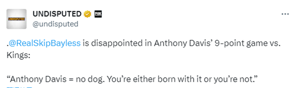 名嘴Skip嘲讽浓眉打球太软,Bubba Dub在节目中表示:垃圾,安东尼-戴维斯昨晚让小萨博尼斯看起来像约基奇。