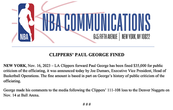 178直播11月17日,NBA官方又公布一笔罚单,快船球星乔治因公开批评裁判被联盟罚款3.5万美元