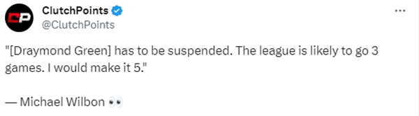 NBA专家Michael Wilbon在节目中表示:联盟大概率会对追梦做出禁赛3场的处罚,而我可能会禁他5场。你会看到大部分类似的比赛联盟禁赛都会在2-3场。