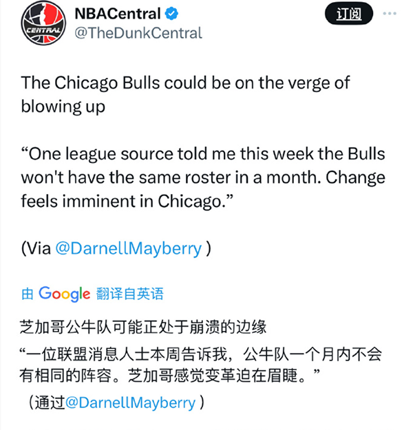 “一位联盟消息人士本周告诉我,公牛队一个月内不会有相同的阵容。芝加哥感觉变革迫在眉睫。”