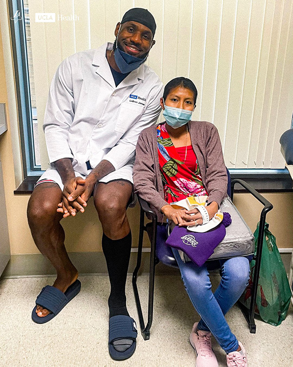 詹姆斯身穿白大褂,面带笑容与患者家属合影,老詹的左脚上穿着长筒袜,此举应该是为了给受伤的小腿保暖;在此前湖人击败太阳的比赛中,詹姆斯的小腿被撞伤,因伤缺席了一场比赛,下一场对阵灰熊,詹姆斯被列为出战成疑,50%可能性出战。
