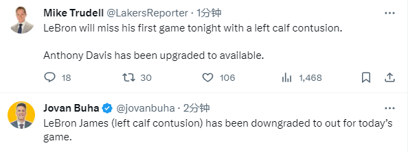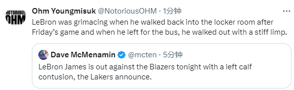 目前詹姆斯的出战状态已经从出战成疑降级为缺战,浓眉的状态则升级为可以出战;名记Ohm Youngmisuk报道,返回更衣室时,詹姆斯走路有轻微跛脚,之后一瘸一拐离开球馆去乘坐球队大巴。