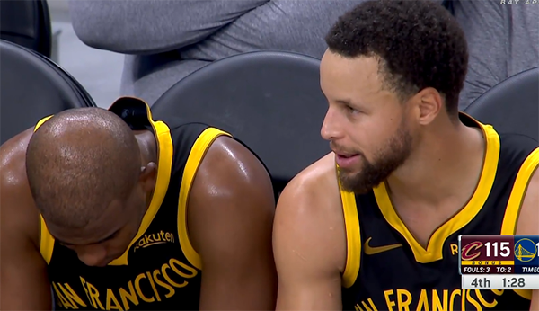 末节,勇士再次被骑士拉开分差,8分19秒库里重上场,库里抛投打铁以及出现失误,6分03秒勇士落后到12分,汤普森2分止血,库里高难度上篮和三分继续打铁,汤普森反击上篮和轰进三分,加兰回应三分,勇士失误,2分12秒,科尔早早换下主力,库里等人都提前放弃比赛,坐在替补席一脸沮丧和无奈,最终勇士输掉比赛,本赛季常规赛惨遭骑士横扫。