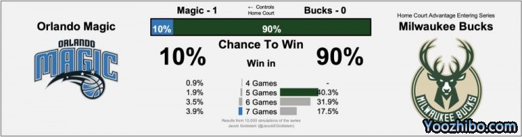 不过,虽然雄鹿输了G1,但他们仍是晋级的大热门,有90%的概率淘汰魔术。其中,雄鹿4-1淘汰魔术的概率是40.3%,6场晋级的概率是31.9%,抢七晋级的概率是17.5%。