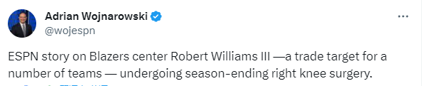 178直播11月11日讯 据ESPN名记woj报道,波特兰开拓者队中锋罗伯特·威廉姆斯将接受右膝手术,确定赛季报销,预计将在下赛季完全康复。