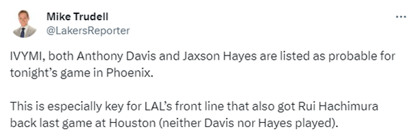 在湖人和太阳大战之前,湖人官方表示,浓眉(左臀)和海斯(左脚踝)的出战状态都从出战成疑升级为大概率出战,75%可能性出战。