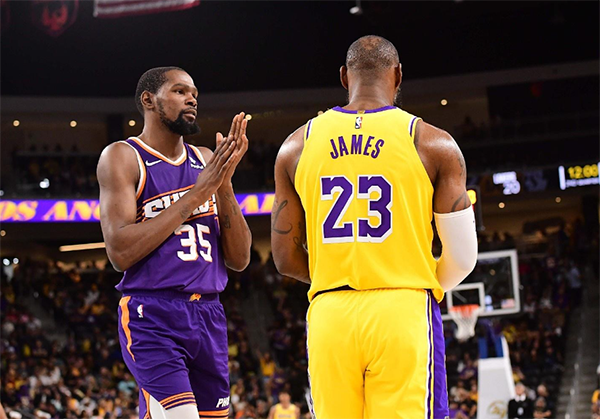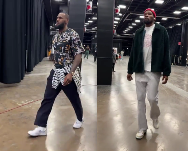 178直播11月11日讯 ,NBA季中锦标赛比赛日,湖人客场大战太阳,这是两队的锦标赛首秀,赛前,NBA官方晒出詹杜入场的帅照,詹姆斯身穿扎染T恤,走进球馆时一脸严肃,杜兰特戴着小红帽十分抢镜。