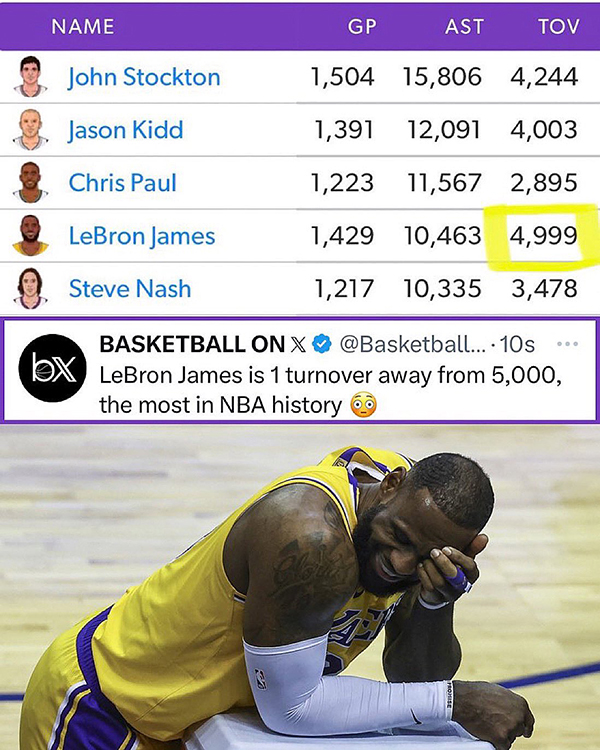 今日一战,詹姆斯很可能继续刷新一大扎心纪录,目前詹姆斯常规赛总失误数为4999次,只要再失误1次,他就会成为历史上第一位失误总数突破5000次大关的球员,继续刷新历史失误王的纪录。