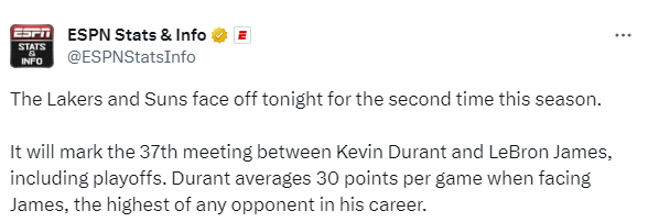 本赛季詹杜已经交手过一次——10月27日湖人主场击败太阳,詹姆斯21分8篮板9助攻,杜兰特空砍39分11篮板;时隔15天,联盟大小王再次对决,这将是杜兰特和詹姆斯生涯的第37次交锋(包含季后赛)。