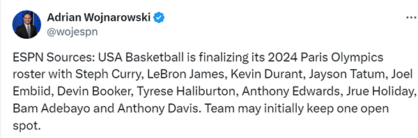 178直播讯 北京时间4月16日,据名记Woj报道,美国男篮即将出炉2024年巴黎奥运的参赛球员名单,目前已经敲定11人,他们分别是:库里、詹姆斯、杜兰特、塔图姆、恩比德、布克、哈利伯顿、爱德华兹、霍乐迪、阿德巴约和浓眉,球队可能会暂时空缺一个名额。至于谁能赶上末班车,目前还不确定。