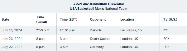 美国男篮已经敲定了三场热身赛。他们将在7月11日(北京时间,下同)在拉斯维加斯与加拿大男篮进行一场热身赛,7月21日与南苏丹、7月23日与德国在伦敦打热身赛。