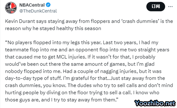 178直播讯 北京时间4月16日,杜兰特解释了自己本赛季能够远离伤病的原因,表示自己知道那些人经常假摔,并直言:我远离了那些会假摔的人。