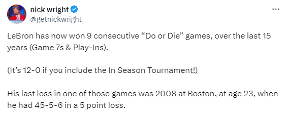 据统计,过去15年,詹姆斯在生死战已经豪取9连胜(季后赛抢七和附加赛),若算上季中赛的话,詹姆斯生死战已经豪取12连胜。