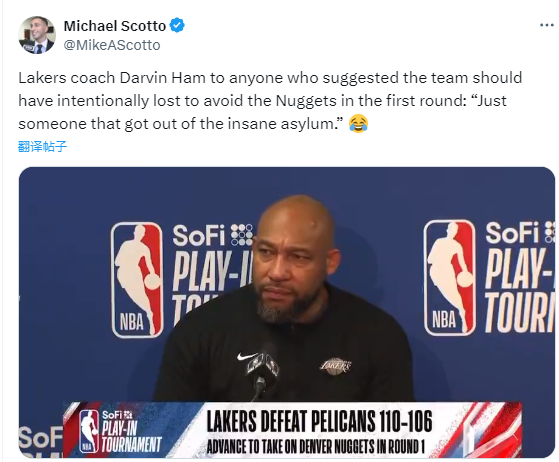 湖人首轮挑战掘金,根据赛程,两队系列赛G1将在4月21日上午8点30分开打;对于外界的质疑声,湖人主帅哈姆赛后强势回应:任何觉得我们应该故意输球而避开掘金的人,都是神经病。