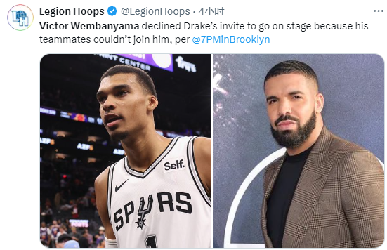 雷迪克在节目中爆料,文班因队友上不了台而拒绝德雷克的邀约,雷迪克透露:我记得我是从马刺的训练营听到的这个故事。赛季早期吧,歌手德雷克在奥斯汀有一场演唱会。那边问文班是否愿意在期间受邀上台,因为德雷克在休赛期和很多NBA球员都这么互动了。文班就问对面:‘我的队友们能和我一起上台吗?因为他们会和我一起去演唱会。’结果德雷克那边说不行。文班亚马听了之后就说:‘哦那我就不上台了。