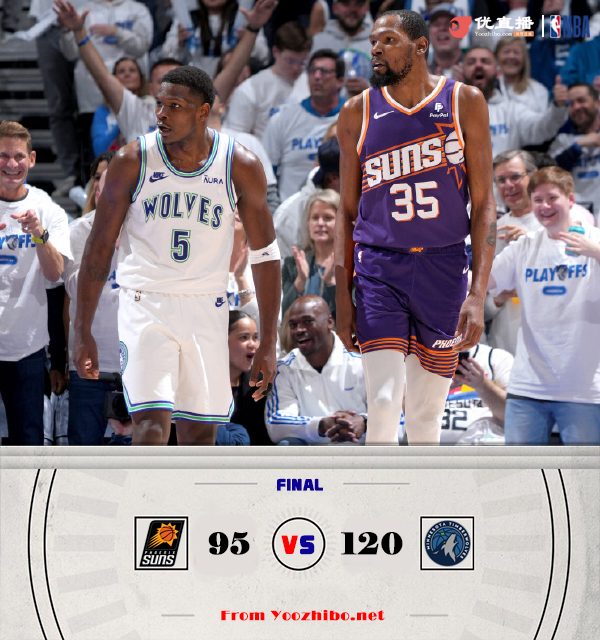 NBA季后赛,太阳客场挑战森林狼。比赛开始,杜兰特高效输出,爱德华兹和戈贝尔联手拿分给出回应,奥尼尔连中三分,次节双方继续缠斗,森林狼多点开花,杜兰特稳扎稳打带队咬住,但此后太阳连续打铁失误,森林狼持续发力获得两位数优势,半场战罢森林狼61-51领先10分。易边再战,杜兰特和比尔联手包揽球队16分将分差缩小到只剩4分,但此后太阳突然哑火,森林狼轰出21-5一举获得20分优势,末节森林狼三分3连击继续扩大优势,太阳大势已去无力回天。最终,森林狼120-95击败太阳,1-0领先。