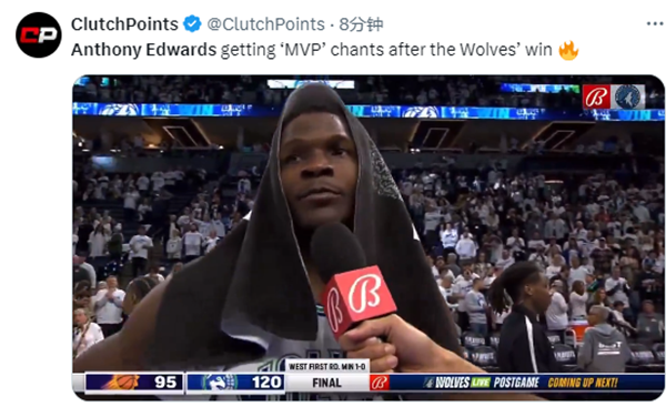 178直播讯 北京时间4月21日,NBA季后赛森林狼120-95大胜太阳25分,系列赛总分1-0开门红;爱德华兹打出疯狂一战,全场24投14中拿到33分9篮板6助攻,第三节11中8爆砍18分,多次单挑杜兰特以及狂喷死神,末节抢断反击暴扣杀死比赛,赛后球迷为华子高呼MVP。