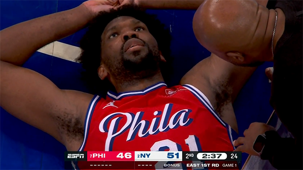 178直播讯 北京时间4月21日,NBA季后赛正式开打,在76人和尼克斯系列赛G1比赛中,恩比德扣伤膝盖轰然倒下,费城惨遭重创,大帝又伤了,所幸伤势无大碍,下半场继续比赛。