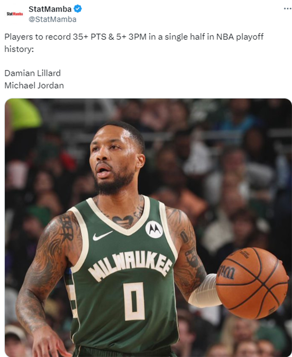 4、利拉德比肩乔丹,成为NBA历史上第二位在季后赛中半场至少拿到35分且命中5记三分的球员