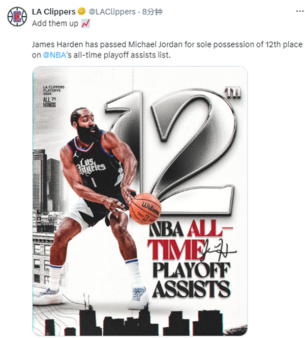 178直播讯 北京时间4月24日,NBA季后赛快船G2再战独行侠,哈登迎来里程碑,季后赛生涯总助攻数超越乔丹升到历史第12位。