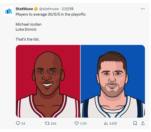 4、东契奇比肩乔丹成为历史上第二位季后赛场均至少拿到30分5篮板5助攻的球员