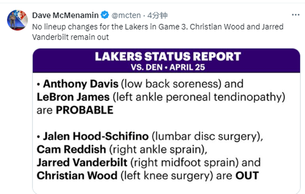 湖人G3伤病报告——安东尼-戴维斯(下背部酸痛)、詹姆斯(左脚踝腓侧肌腱炎)大概率出战;雷迪什(右脚踝扭伤)、希菲诺(腰椎间盘手术)、范德比尔特(右中足扭伤)和伍德(左膝手术)都继续缺席比赛。