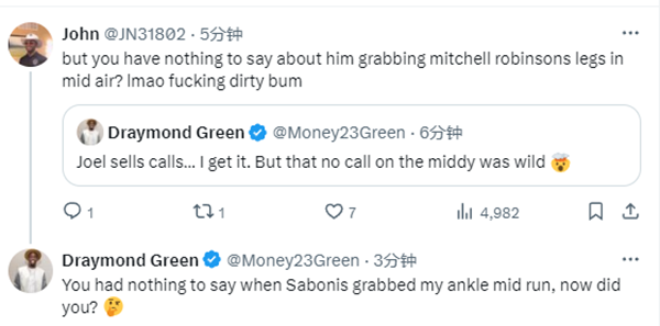 追梦遭质疑,一位名为John的网友质问追梦:但是恩比德抓米罗腿的时候你怎么不说话了?肮脏的动作。追梦立即回应:当萨博尼斯抓我脚踝的时候,你咋不说,现在你问我?