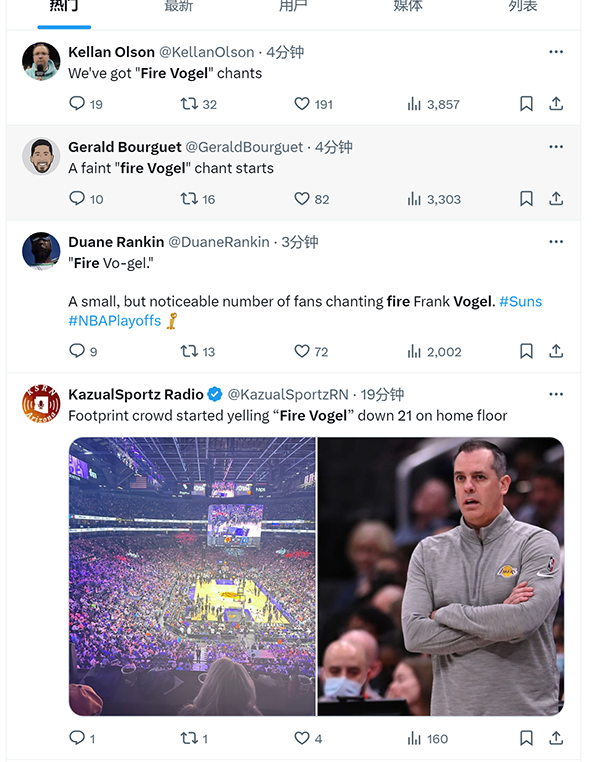178直播讯 北京时间4月27日,系列赛G3回到主场,太阳109-125又被森林狼打爆了,杜兰特绝望离场,太阳球迷高呼沃格尔下课。