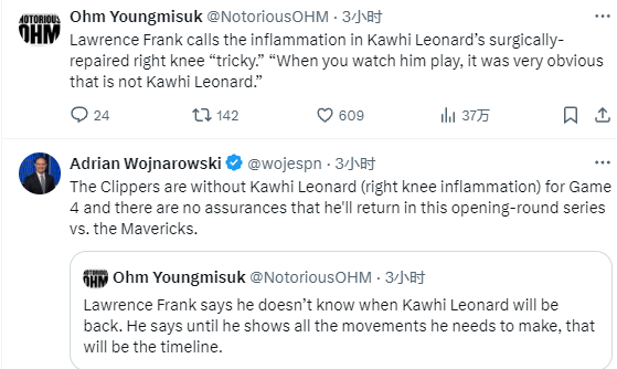 ESPN名记woj报道,目前暂无小卡的复出时间表,无法保证小卡能在首轮对阵独行侠的比赛中复出。