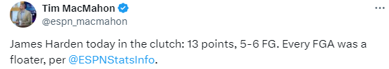 快船随队记者Farbod盛赞哈登,发推写道:今天这场无疑是哈登快船生涯最佳一战,投篮出手选择完美,有后撤步、中距离、还有抛投。