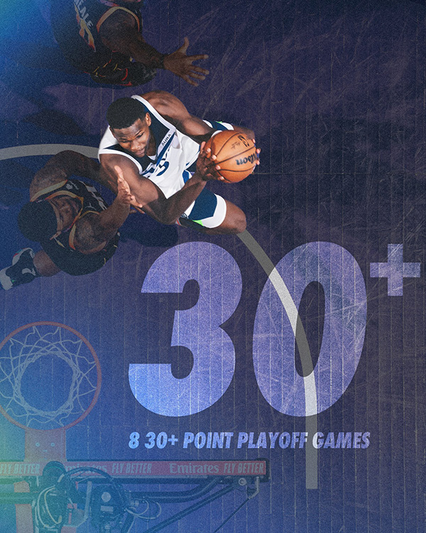 1、爱德华兹季后赛生涯第8次得分30+,超越加内特成为队史季后赛30+第一人