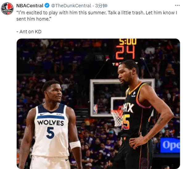 接受采访时,爱德华兹谈到横扫杜兰特,表示:我非常尊重他,他每天晚上都会上场竞争。我从五岁开始起就看他的每一场比赛。我喜欢他。我期待这个夏天和他一起并肩作战(奥运)。说点垃圾话吧,让他知道我送他回家了。