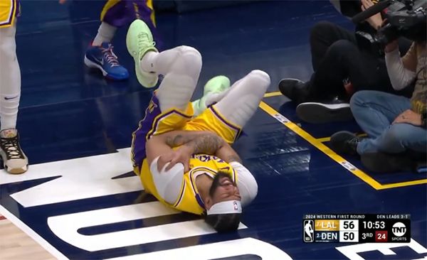第三节10分53秒,浓眉在篮下和波特撞了一下肩膀,之后浓眉捂着肩膀痛苦倒地不起,詹姆斯赶紧坐过去,湖人队医过来查看浓眉的伤势,詹姆斯和拉塞尔都站在浓眉旁边,一脸担忧的表情;湖人主帅哈姆同样十分担忧。