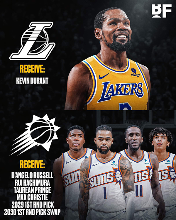 美媒列出一笔杜兰特1换6加盟湖人的交易方案:湖人把拉塞尔、八村垒、普林斯、克里斯蒂、2029年首轮签和20230年首轮互换权送到太阳,最终得到杜兰特;换言之,美媒建议湖人6换1引援杜兰特,打造詹眉杜新三巨头。