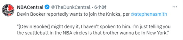 今日名嘴A-史密斯在节目中爆料:布克可能会否认,我还没有联系他。我只是告诉你,NBA圈子里有传言称,他想去纽约(尼克斯)。
