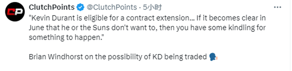 对于杜兰特的未来,名记Brian Windhorst表示杜兰特今夏有资格提前续约,若他今夏明确表示不想和太阳续约,那么就可能会发生一些大事情。