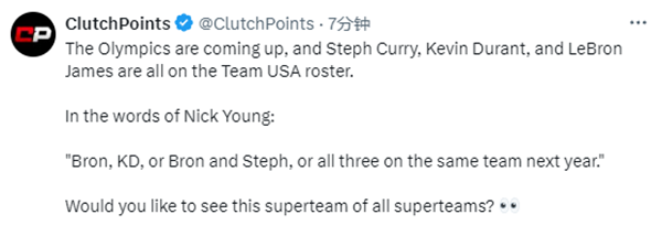 今夏杜兰特、詹姆斯和库里将一起征战奥运会,美媒借用前NBA球员尼克杨的话:詹姆斯杜兰特或者詹姆斯库里,或者他们三分新赛季会在同一支球队。